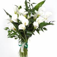 Изящный и утонченный букет из классических белых калл. Символично эти цветы обозначают скромность и уравновешенность. Рускус и аспедистра очень удачно разбавляют цветовую гамму, подчеркивая прелесть и «чистоту» калл. Эта композиция – отличный способ выразить свое восхищение понравившейся даме, даже если вы еще мало знакомы с ней. Цветы скажут о вашем благородстве и чистоте намерений.